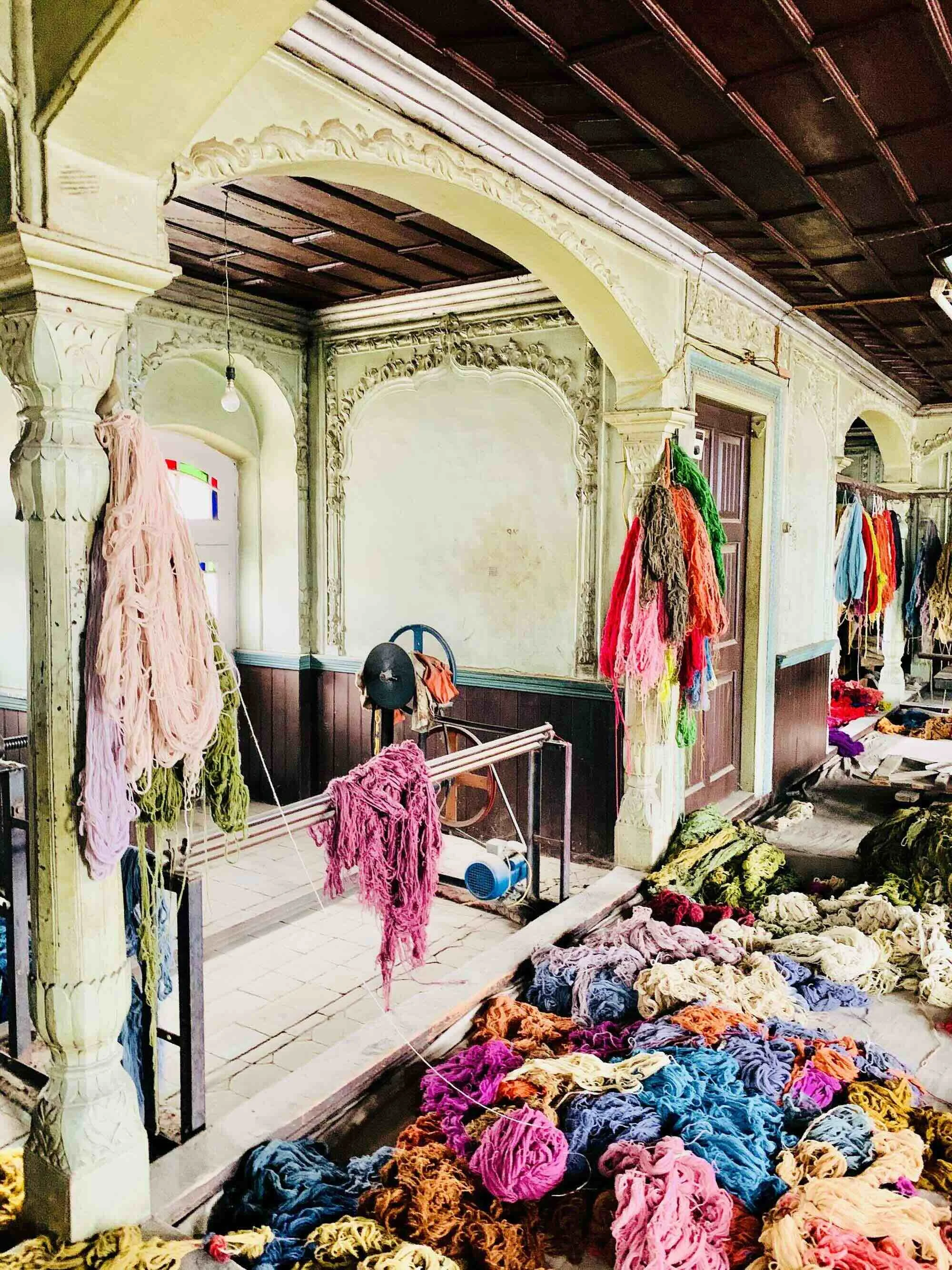 Inside a room with ornate architectural details, a display of colorful yarns and textiles on tables and hanging from hooks.