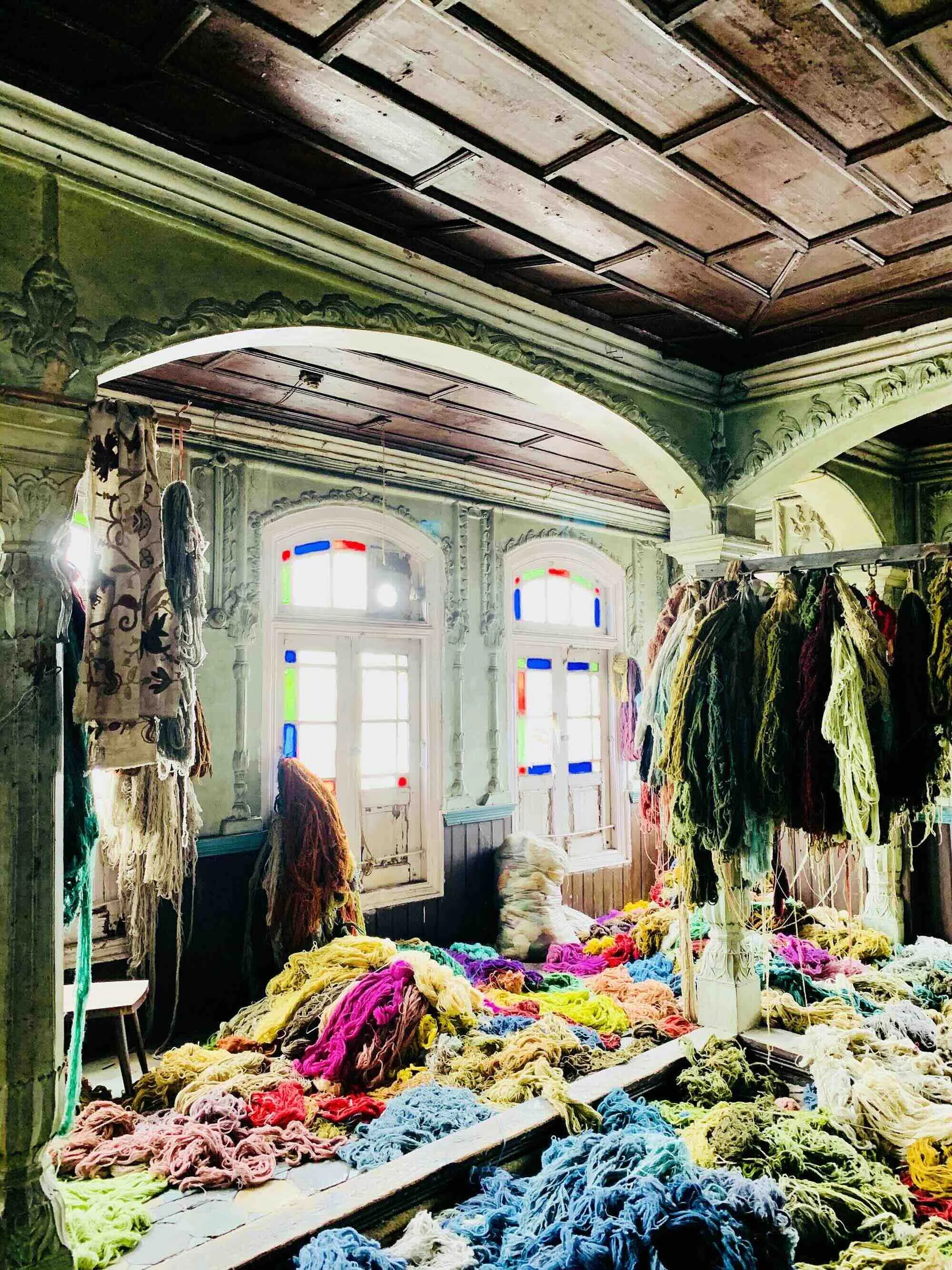 Room filled with colorful yarns and textiles, with stained glass windows and ornate wooden ceiling.